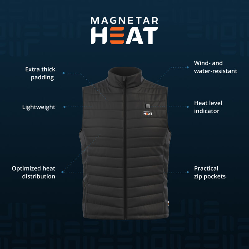 De verwarmde bodywarmer van Magnetar Heat is een bodywarmer met ingebouwde verwarmingselementen en een oplaadbare powerbank. Door de accu worden de verwarmingselementen verwarmd, dit zorgt er voor dat je warm blijft in een koude omgeving. Onder de bodywarmer kun je bijvoorbeeld nog andere kleren dragen, zoals truien, shirts en vesten. Ook over de bodywarmer kan jij je jas dragen. Door de warmte van de bodywarmer zullen deze kledingstukken ook lekker warm aanvoelen en ben je dus perfect verwarmd in de winterse buitenlucht of een andere koude omgeving.